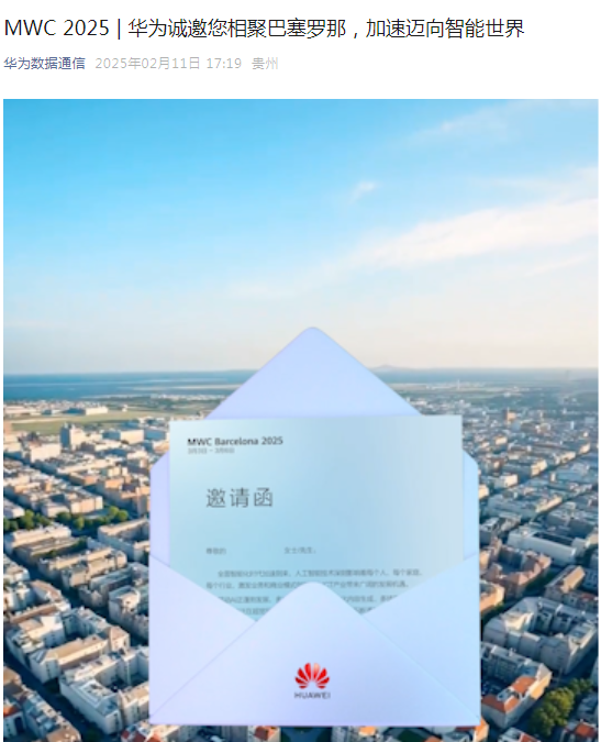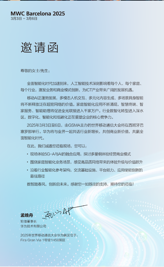 据华为数据通信官方微信号,2月11日,华为常务董事、副董事长、轮值董事长孟晚舟发布邀请函,为华为即将亮相2025世界移动通信大会(简称“2025 MWC”)预热。