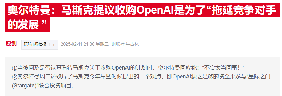 马斯克牵头的财团提出以974亿美元收购OpenAI,但遭到OpenAI CEO奥尔特曼的公开回绝。双方就此事展开口水战,马斯克指责OpenAI垄断市场,奥尔特曼则称马斯克夸大贡献。