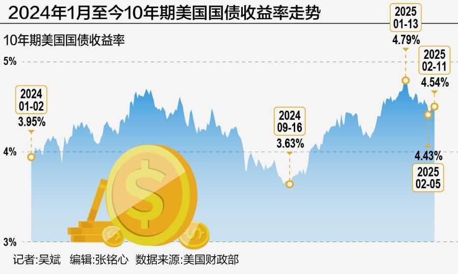 美联储决策者对特朗普的一系列政策感到担忧,例如加征关税和大规模驱逐非法移民等,经济学家普遍认为,这会导致美国通胀再次上升。德意志银行预计,仅钢铝关税一项就会使核心PCE价格指数上升0.4个百分点。2月11日,鹰派美联储已经推动10年期美债收益率重返4.5%上方,美元指数也保持在高位。