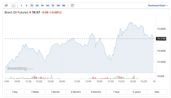 周一亚洲盘交易中,国际油价波动较小,布伦特原油价格保持在74美元/桶以上。上周五,受乌克兰战事升级影响,地缘政治风险溢价提升,油价攀升约1%,收于两周来的最高点。