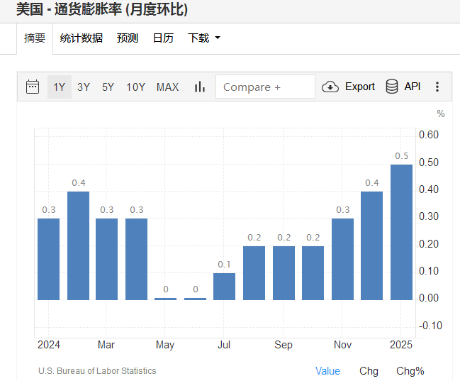 美国劳工统计局(BLS)表示,上个月美国消费者价格指数(CPI)环比上涨0.5%,是自2023年8月以来的最大涨幅,同比上涨3.0%,创2024年6月以来新高,前值为2.9%。