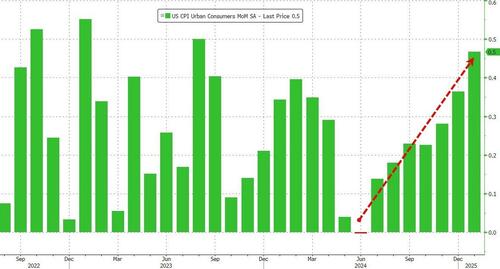 美联储官员密切关注的核心CPI升幅同样大于预期。剔除食品和能源成本的1月核心CPI同比上涨3.3%,高于预期的3.1%;1月季调后核心CPI月率录得0.4%,为2024年3月以来最大增幅,高于预期的0.3%。这份全面超出市场预期的CPI报告,令所有市场人士大跌眼镜。甚至产生这样一种对美联储的怨怼情绪:去年9月份大幅降息50个基点的宽松行动,是否在自己“葬送”抗通胀的完美好局。自从去年大选前的秋天连续开始降息后,美国CPI同比涨幅就在一路走高。