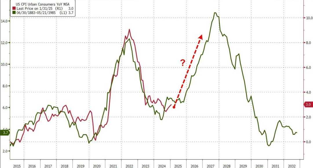 注:绿线为1883年至1985年的CPI走势,红线为自2015年起的CPI走势