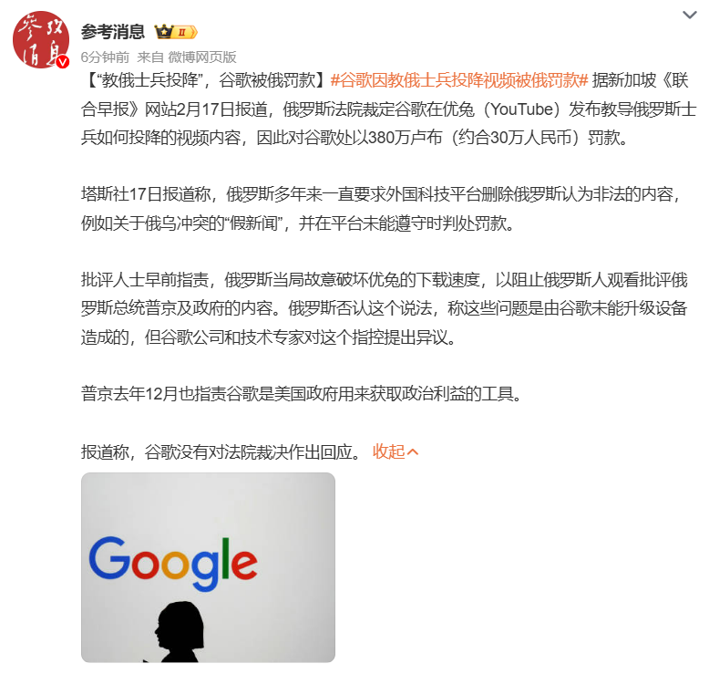 据参考消息援引新加坡《联合早报》网站2月17日报道,俄罗斯法院因谷歌在YouTube发布教导俄罗斯士兵投降视频,对谷歌处以380万卢布(约合30万人民币)罚款。此举反映了俄罗斯对互联网内容管控的加强。