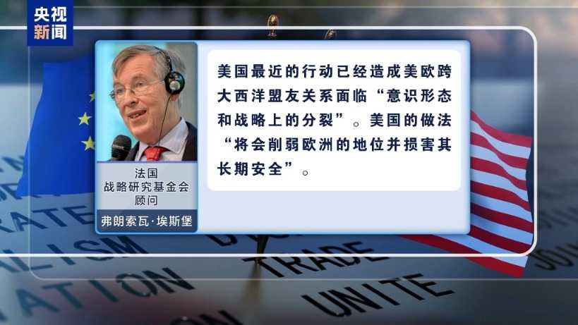 法国战略研究基金会顾问弗朗索瓦·埃斯堡表示,美国行动已致美欧跨大西洋关系面临意识形态和战略分裂,将削弱欧洲地位,损害其长期安全。