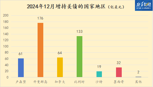 具体数据显示,截至2024年12月,日本减持美债273亿美元,与2023年12月相比减持了555亿美元;中国大陆减持96亿美元,与2023年12月相比减持了573亿美元;英国则减持441亿美元。而增持美债的投资者中,开曼群岛和比利时分别增持176亿美元和133亿美元。卢森堡自2024年4月起连续增持。