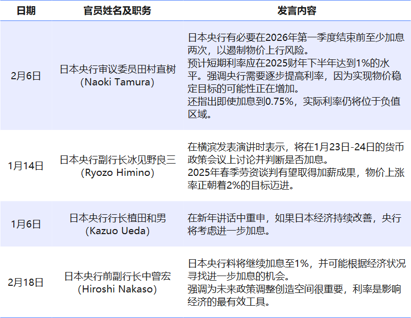 此外,日本国债收益率上升,而美国10年期国债收益率相对稳定,导致美日利差收窄,这为日元提供了支撑。加息预期增强,田村直树和其他官员的评论表明,日本央行可能会采取更加鹰派的立场。