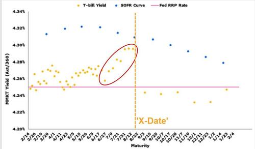 美国短期国库券收益率曲线已出现扭曲。在濒临债务上限“X日”前到期债券收益率反常攀升。
