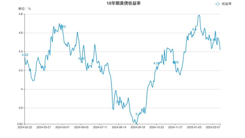 据美国财政部数据,截至当天收盘,2年期美债收益率为4.19%,下跌8BPs,创1月27日以来最大单日跌幅;10年期美债收益率为4.42%,下降8BPs,为2月13日以来最大单日跌幅;30年期美债收益率为4.67%,下跌7BPs。经济指标显示放缓。