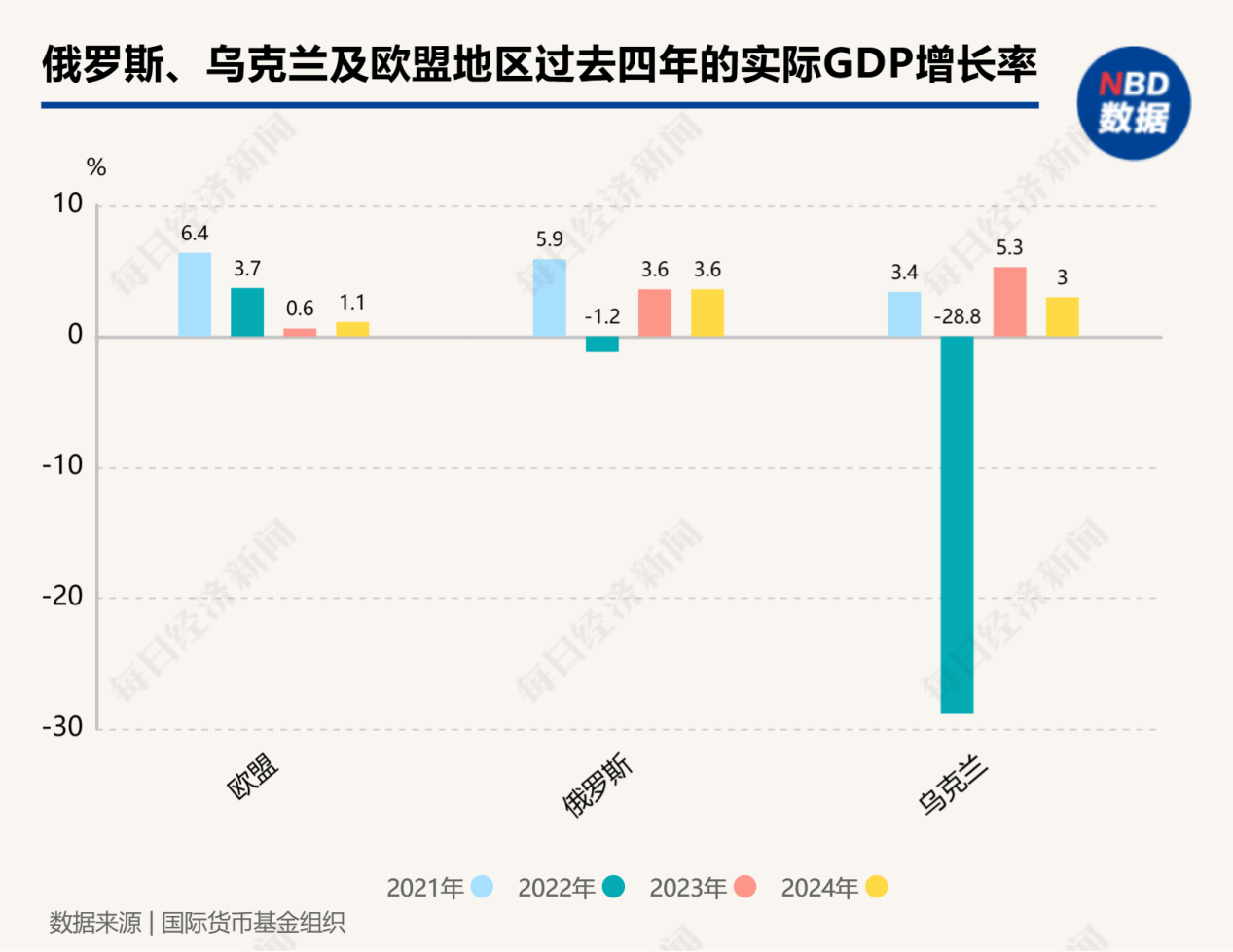 数据上看,俄罗斯经济整体呈稳定态势。国际货币基金组织(IMF)数据显示,继2022年下跌1.2%之后,俄罗斯2023年和2024年的实际GDP均增长3.6%,但通胀依然高企,2023年和2024年均保持在7.4%。乌克兰经济遭受的冲击更大,2023年经济有所回暖,但2024年受能源基础设施受损等因素影响,经济增长放缓,同时通胀大幅升至9%。