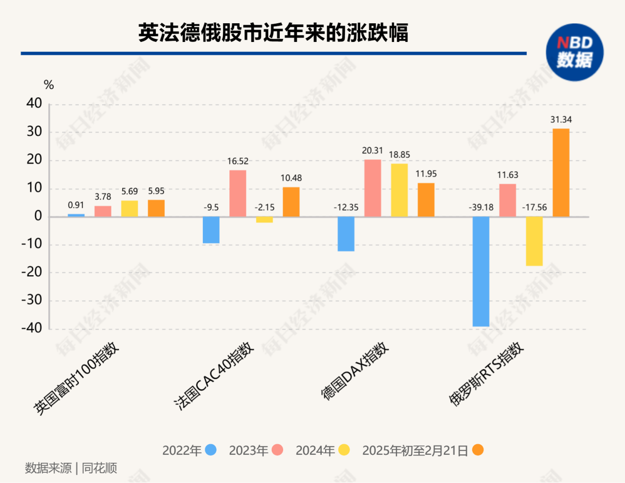 卢布兑美元年初以来涨28%,成今年表现最佳的新兴市场货币。尽管基本面低迷,但欧洲三大主要股指过去三年均呈上涨走势。俄罗斯股市今年以来高速上涨,截至2月21日收盘,累计涨幅已超31%。同时,俄罗斯央行数据显示,卢布兑美元自今年初以来上涨28%。