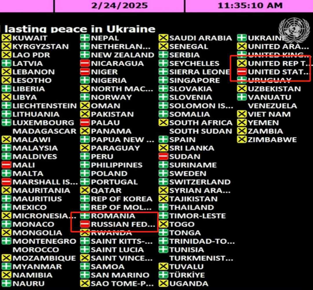 恰逢俄乌冲突三周年,乌克兰提案呼吁“公正、持久和全面的和平”,并谴责俄罗斯,获得93票赞成,18票反对和65票弃权。值得注意的是,美国和俄罗斯均投出反对票。