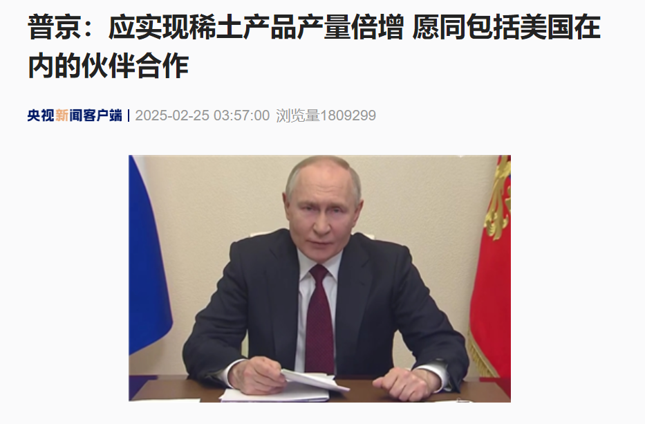 同日,俄罗斯总统普京表示,俄稀土储量多于乌克兰,愿同相关伙伴开展合作,包括同美国的合作。他强调,美乌可能达成的矿产资源协议与俄无关。