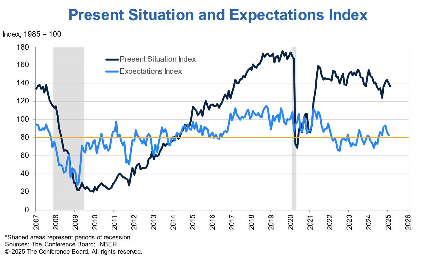 与此同时,现状指数和预期指数均有所下降,特别是预期指数自去年6月以来首次跌破80,这通常被视为未来经济衰退的预警信号。