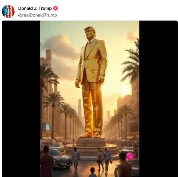 该视频发布在特朗普自创的社交媒体平台“真实社交”上,时长33秒,包含多个令人印象深刻的画面,如巨大的金色特朗普雕像、写着“特朗普加沙”的辉煌大楼等。