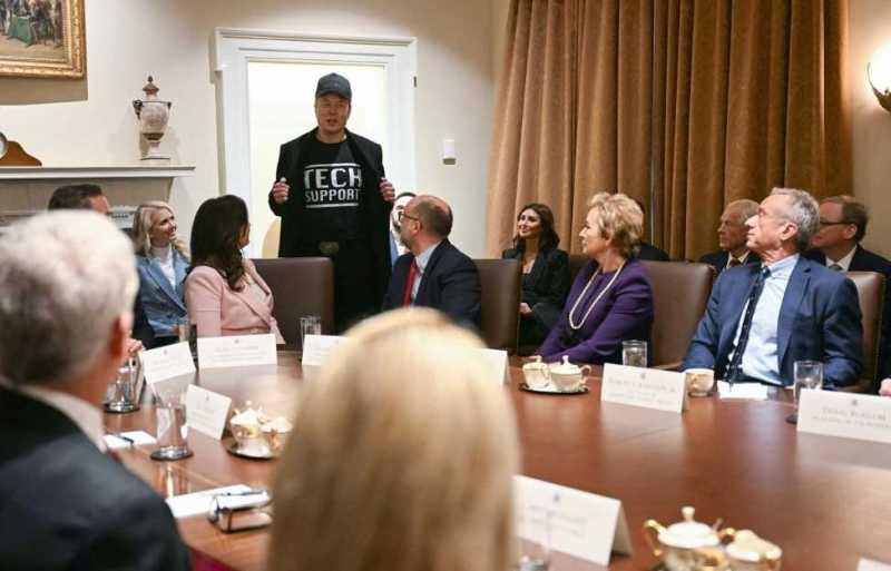 虽然并非内阁成员,但世界首富马斯克以“政府效率部”人员身份列席会议,低调坐在会议室角落。特朗普特意点名让马斯克发言,马斯克则穿着标志性的“技术支持”T恤,表示自己只是“技术支持人员”,并介绍了“政府效率部”的工作重点。