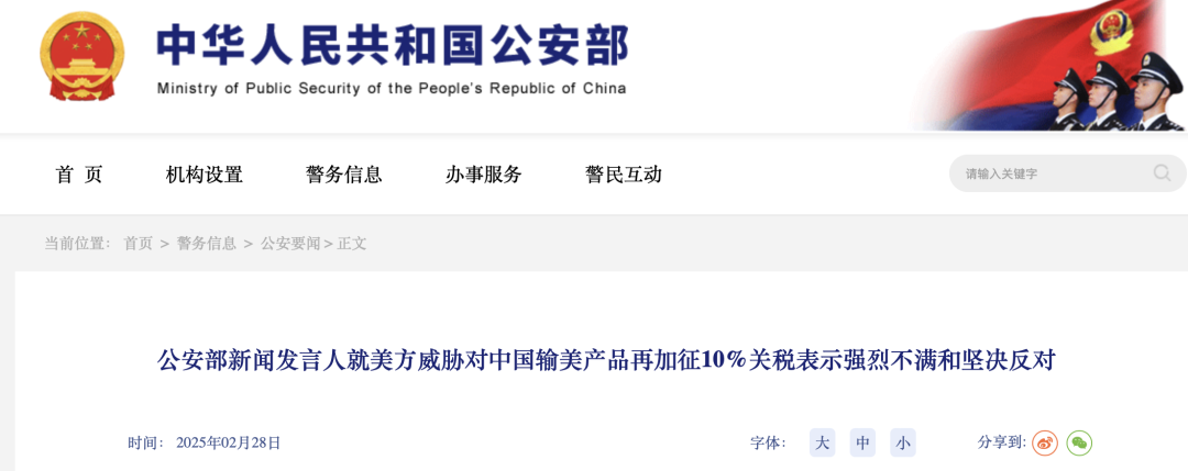 公安部新闻发言人就美方威胁对中国输美产品再加征10%关税表示强烈不满和坚决反对