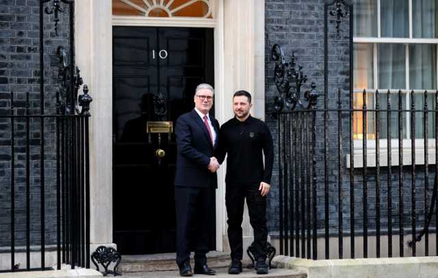 3月1日,英国首相斯塔默(左)与乌克兰总统泽连斯基在英国伦敦唐宁街10号首相府前握手。 新华社发
