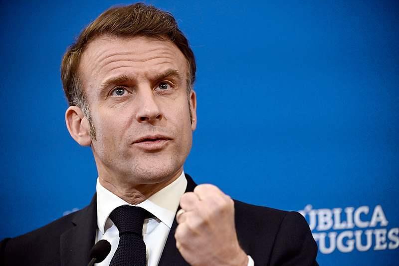 △法国总统马克龙访问葡萄牙,在记者会上发言。