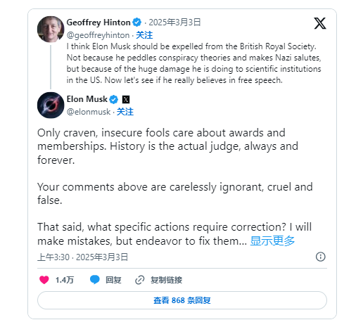在社交媒体平台X上,AI先驱、诺贝尔奖得主杰弗里·欣顿呼吁将马斯克驱逐出英国皇家学会,称其正损害美国科学机构。