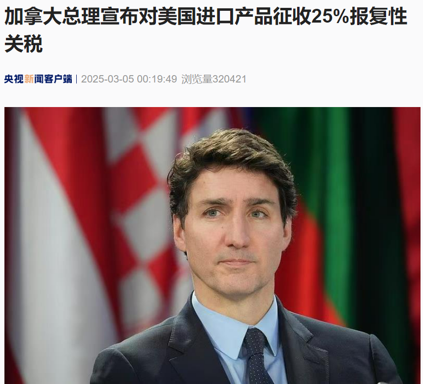 据央视新闻3月5日消息,当地时间3月4日,加拿大总理特鲁多宣布,对从美国进口的产品征收25%的报复性关税。此举引发了国际贸易的广泛关注。