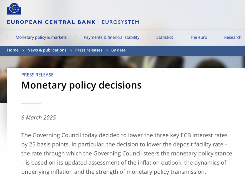 北京时间3月6日晚间,欧洲央行宣布,自2025年3月12日起,三大关键利率均下调25个基点,符合市场预期。