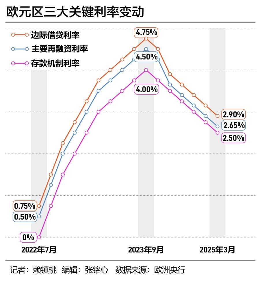 当地时间3月6日,欧洲央行决定将欧元区三大关键利率分别下调25个基点,欧元区存款机制利率降至2.5%,这是欧洲央行自去年6月以来第六次降息。