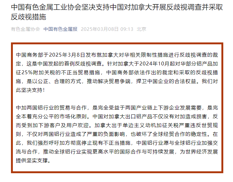 中国有色金属工业协会3月8日特别强调,坚决支持中国政府对加拿大展开反歧视调查并采取相应措施。加拿大自2024年10月起对中国部分铝产品加征25%的附加关税,这一行为属于不正当贸易措施。商务部依法作出的裁定和采取的反歧视措施,旨在以公正、合理的方式推动解决贸易争端,坚决捍卫中国企业的合法权益。