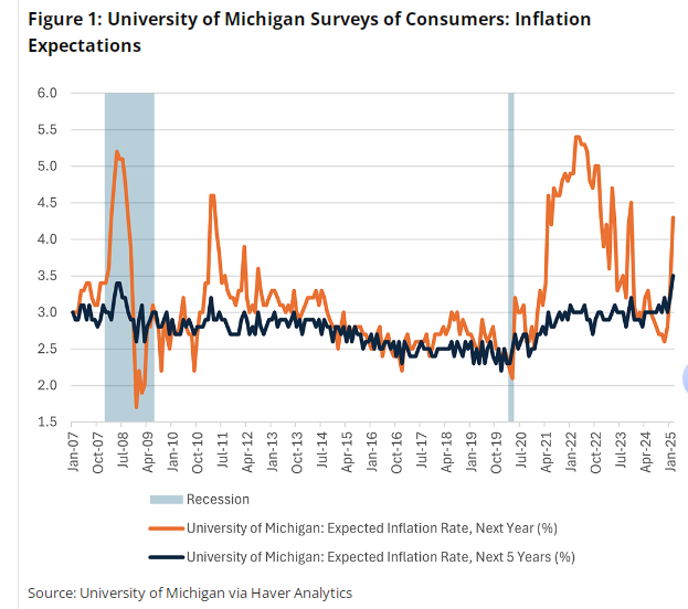 自去年9月份跌至2.4%后,美国整体CPI已连续第四个月上涨,并于今年1月升至3%,进一步偏离美联储的中期目标2%。特朗普贸易关税计划背后的通胀风险逐渐显现,导致近期多项经济数据波动,消费者担忧情绪升温。对于美联储而言,平衡经济和物价成为一大挑战。