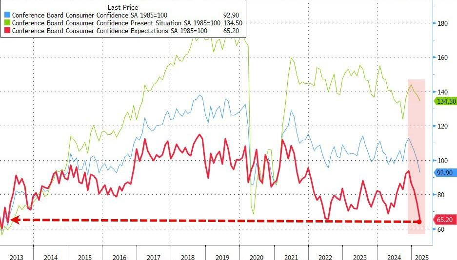 报告还显示,衡量收入、商业和就业市场短期预期的指标降至65.2,为12年来最低,下降9.6点。