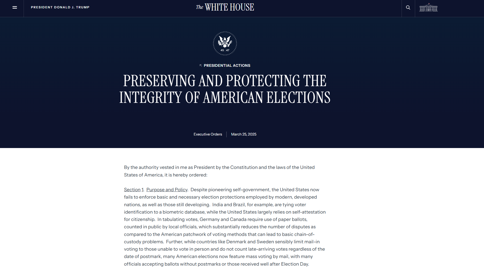 特朗普长期以来对邮寄选票及无需身份证明的投票方式表示不满。白宫声明指出,美国作为自治先驱,却未能实施现代国家普遍采用的选举保护措施,如印度、巴西将选民身份与生物特征数据库挂钩,而美国则主要依赖公民自我证明。