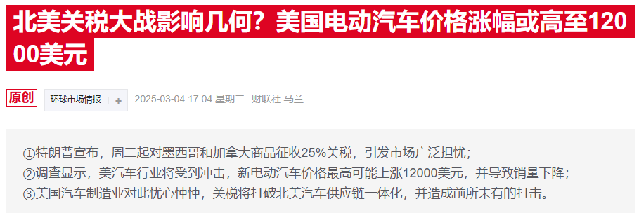 本月早些时候的研究发现,对加拿大、墨西哥等国的汽车征收关税,将使一辆跨界车的生产成本增加约4000美元,而美国制造的电动车成本可能上涨约1.2万美元。