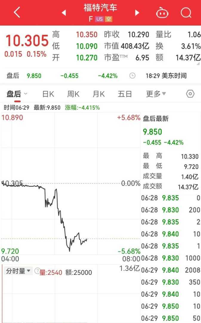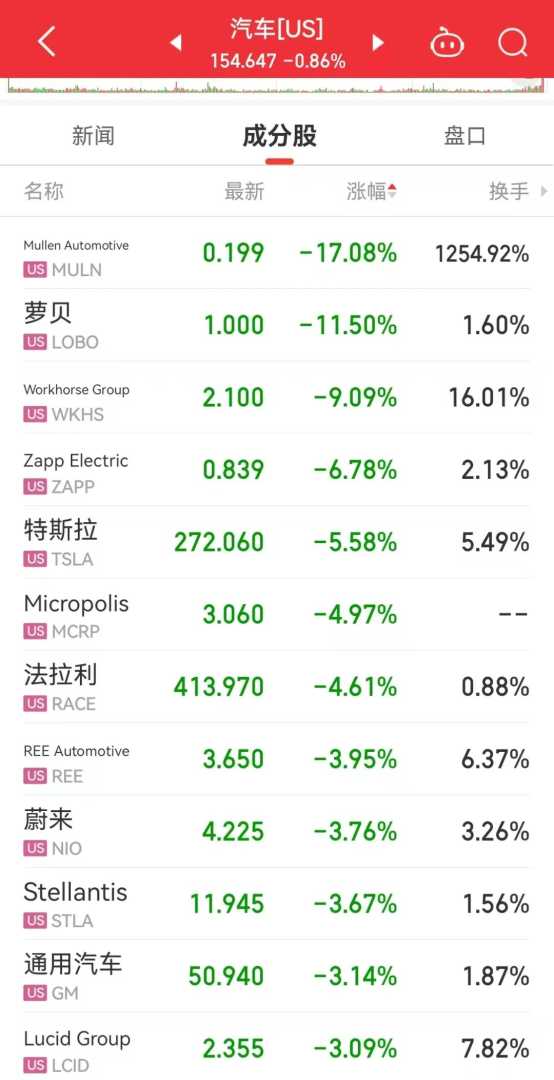 受关税影响,美股三大指数集体收跌,纳指下跌372.85点,跌幅2.04%;标普500指数跌1.12%;道指跌0.31%。美股汽车板块指数跌0.86%。特斯拉跌超5%,法拉利跌超4%。特朗普官宣汽车关税后,汽车股美股盘后遭重挫,通用汽车跌超7%,福特汽车跌超4%,丰田跌超2%。