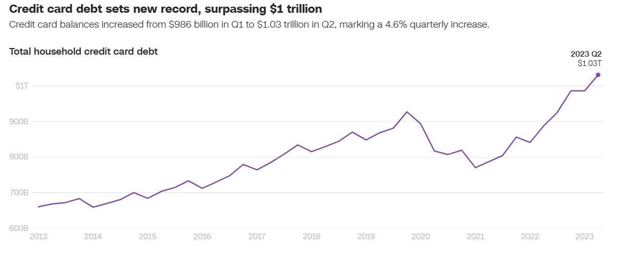 纽约联储在周二发布的《家庭债务和信贷季度报告》中指出,第二季度美国信用卡余额(即信用卡贷款总余额)激增了450亿美元,成为各类债务中增长最快的部分,总额已攀升至1.03万亿美元。