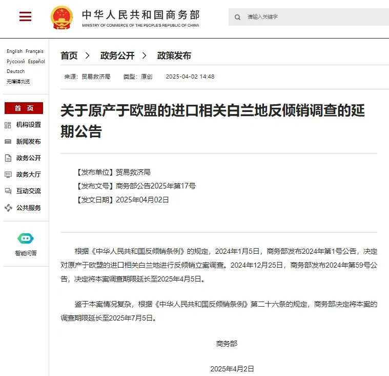 此前,根据《中华人民共和国反倾销条例》的相关规定,商务部已于2024年1月5日发布2024年第1号公告,对原产于欧盟的进口相关白兰地进行反倾销立案调查。同年12月25日,商务部再次发布2024年第59号公告,初步决定将调查期限延长至2025年4月5日,现进一步延期。