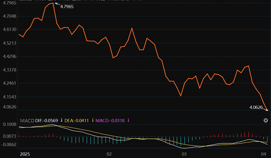 北京时间今天凌晨,美国总统特朗普签署“对等关税”行政令,引发市场震动。美债利率今日大幅下行,截至北京时间11时,10年美国国债利率已下破4.1%。这一举动加剧了美国经济下行的风险,同时也降低了美联储短期降息的可能性。由于美国经济放缓的不确定性,市场预计美债利率仍有进一步下行空间。