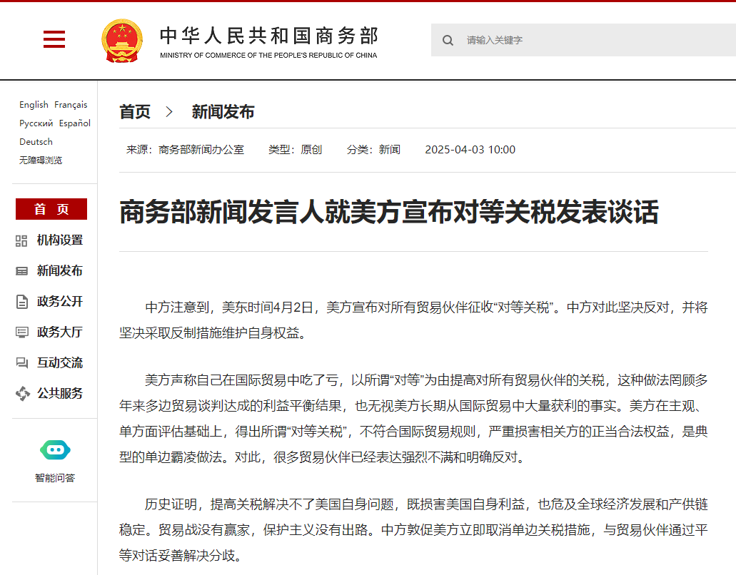 商务部新闻发言人就美方宣布对等关税发表谈话。美东时间4月2日,美方宣布对所有贸易伙伴征收“对等关税”,此举引发广泛关注。