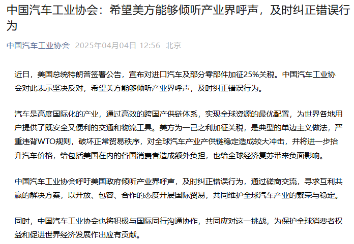 美国总统特朗普宣布对进口汽车及部分零部件加征25%关税,中国汽车工业协会表示坚决反对,呼吁美方及时纠正错误行为,维护全球汽车产业供应链稳定,保护消费者权益,促进世界经济发展。