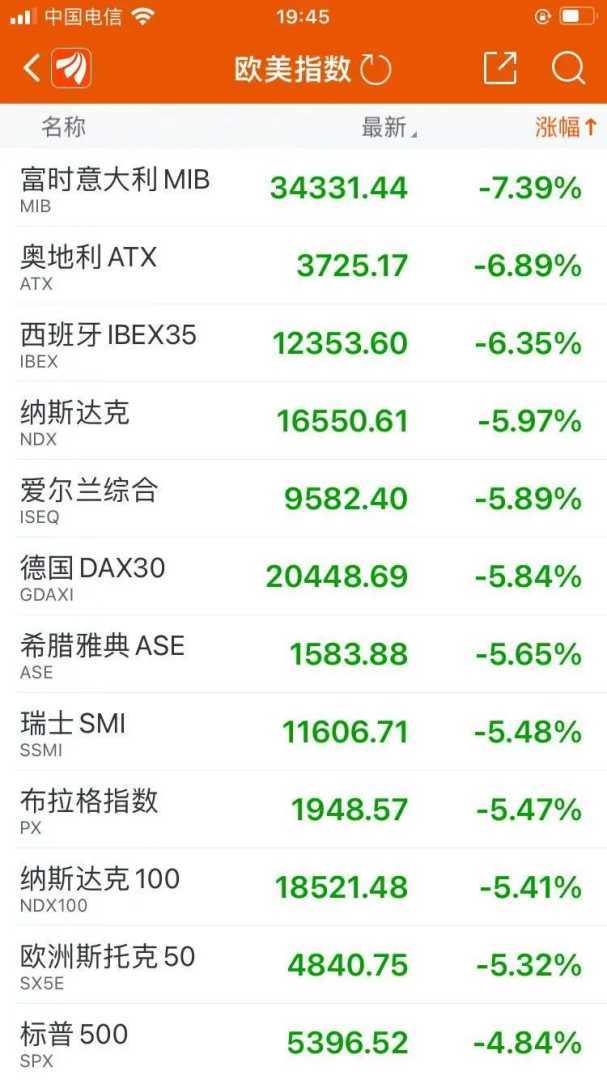 欧洲股市同样受到波及,欧股快速下挫,德国DAX指数暴跌超5%,意大利富时MIB指数重挫超7%,西班牙IBEX35指数跌超6%,法国CAC40指数和英国富时指数分别大跌近5%。