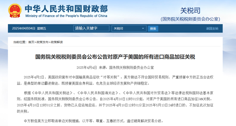 依据《中华人民共和国关税法》、《中华人民共和国海关法》及《中华人民共和国对外贸易法》等相关法律法规,并遵循国际法基本原则,经国务院批准,国务院关税税则委员会发布公告,决定自2025年4月10日12时01分起,对原产于美国的所有进口商品加征34%的关税。对于在2025年4月10日12时01分前已启运,并在指定时间段内进口的货物,将免于加征此次关税。