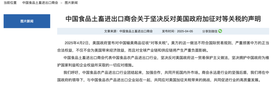 今日,中国食品土畜进出口商会就美征收所谓“对等关税”一事发表声明。