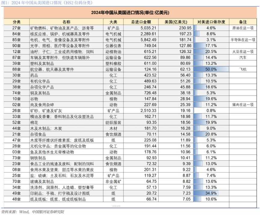 银河证券研报指出,中国对美进口商品依存度最高的是航空器,依存度达50%。自美进口金额超百亿美元的主要集中在矿产品、电气机械、仪器仪表、动植物油等方面。