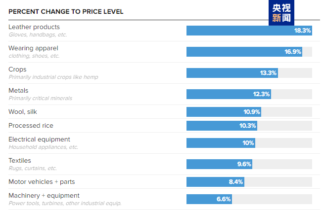 耶鲁大学预算实验室预测,皮革制品、衣服、农作物、金属、羊毛等类别产品价格涨幅将超过10%。