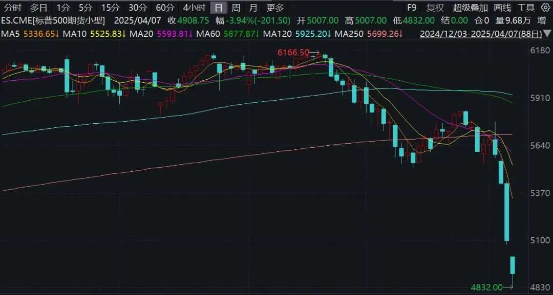 美国“对等关税”政策继续冲击全球金融市场,引发市场剧烈波动。美股股指期货周一开盘后暴跌,纳指期货一度跌超5%,标普500指数期货盘中跌近5%。