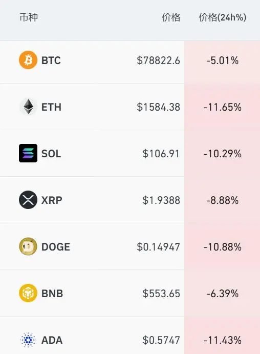 加密货币市场也未能幸免,比特币跌破79000美元/枚,跌幅超过5%;以太坊更是暴跌超11%。全球范围内,超过24万人在最近24小时内因市场动荡而爆仓。