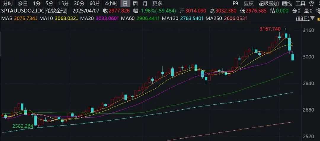 现货黄金也遭受重挫,跌破3000美元/盎司。同时,COMEX期铜也一度跌超8%,显示出大宗商品市场的普遍担忧。
