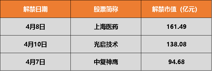 此外,Wind数据显示,本周沪深两市将有19只股票面临限售股解禁,合计解禁市值为473.54亿元,其中上海医药、光启技术、中复神鹰解禁市值居前三位。这一大批限售股的解禁,将对市场造成一定压力。