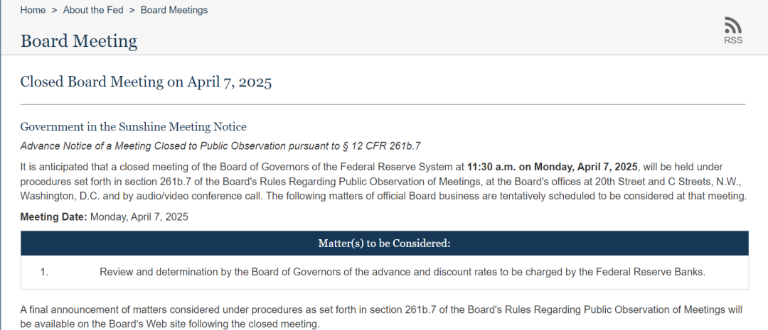 北京时间4月7日晚间,据美联储官网消息,美联储将于当地时间4月7日上午11:30举行理事会闭门会议,主要审查并确定美联储银行所收取的提前和贴现利率。这一消息引发了市场广泛关注。