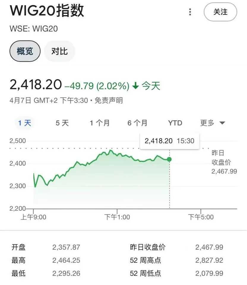 欧洲市场方面,波兰华沙证券交易所因市场波动较大暂停交易一小时。交易恢复后,WIG20指数跌幅收窄。欧洲其他主要股指跌幅也较盘初收窄。