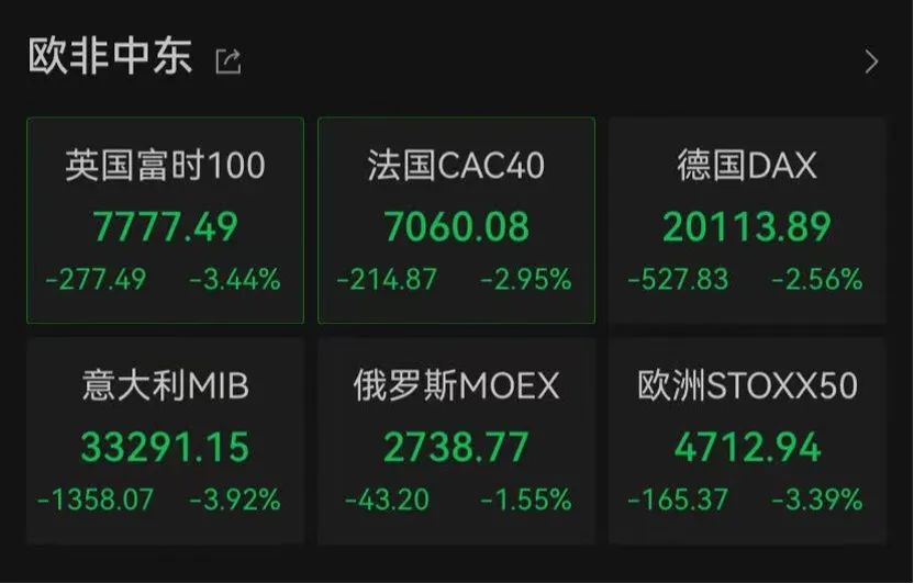 欧洲市场方面,波兰华沙证券交易所因“安全原因”于周一下午暂停交易一小时。其他主要股指跌幅收窄,德国DAX指数跌幅收窄至2%,英国富时100指数跌幅收窄至3.44%,法国CAC40指数跌幅收窄至2.95%。美股大幅震荡